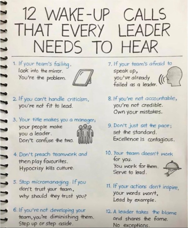 Leadership is a journey filled with continuous learning and growth. Recently, I came across a powerful photo on LinkedIn that shared 12 wake-up calls every leader needs to hear. These insights are vital reminders that no matter how experienced or skilled you are, there's always room for improvement. Let's dig into a handful of these wake-up calls and explore their deeper meanings. Remember, leadership is not about being perfect—it's about embracing opportunities for growth.